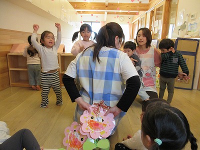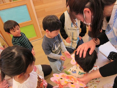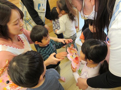 クイズのあとは、うさぎ・ひよこ組さんからぱんだ組さんへのプレゼント渡しを行いました。