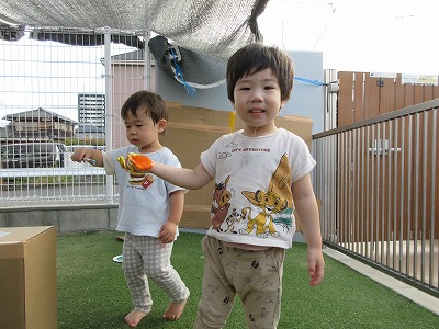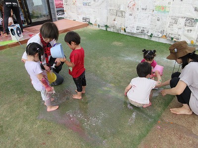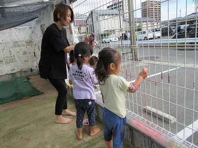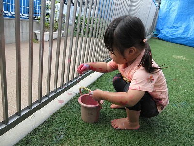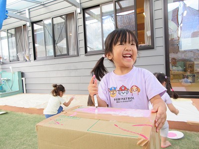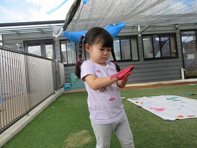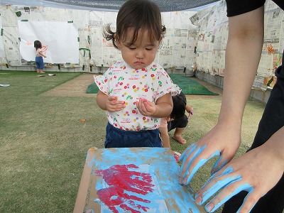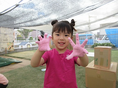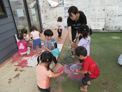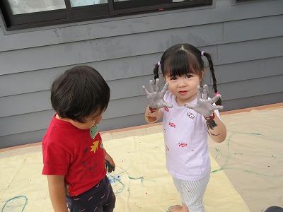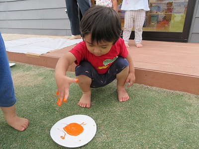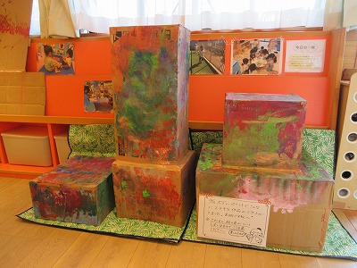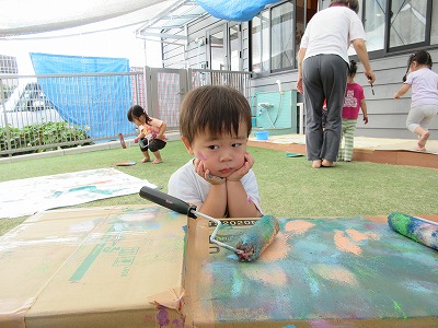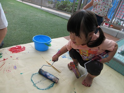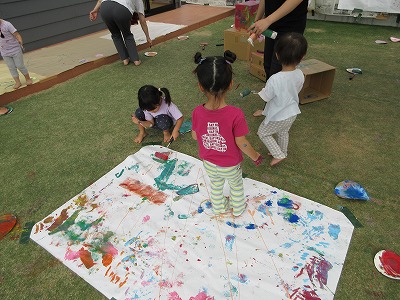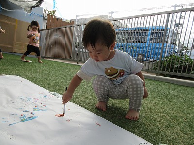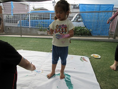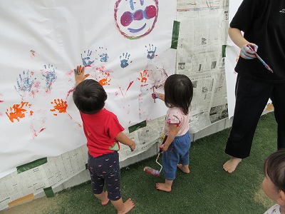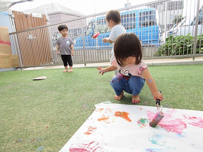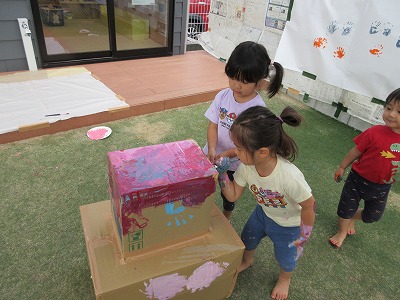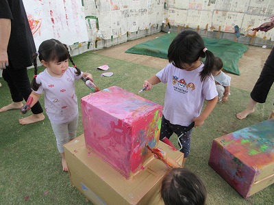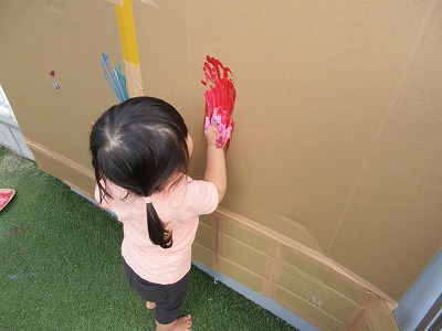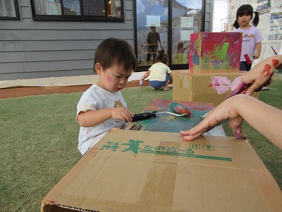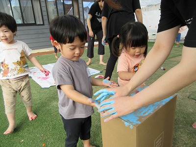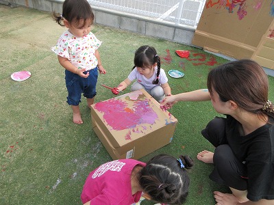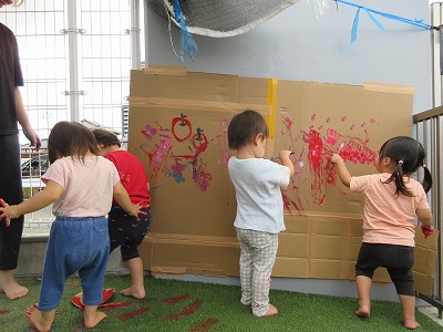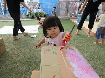前回に引き続き、手足に絵の具をつけたり、筆で描いたりしました。今回は、立体の段ボール箱に描いたり、ローラーを使って描いたりもしました。
