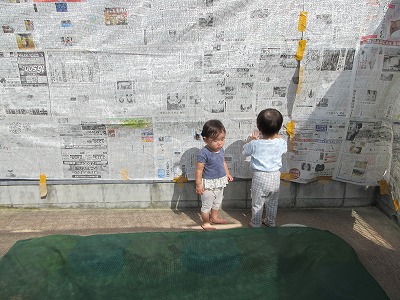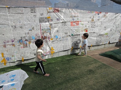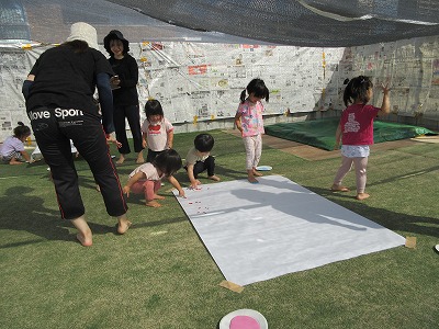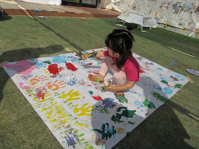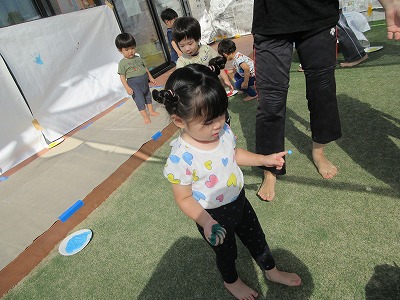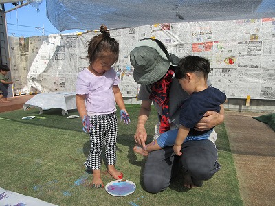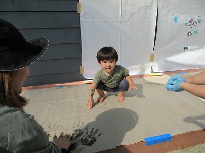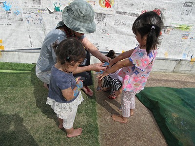 ボディーペイントを楽しんだ後は、ぱんだ組のおともだちを中心に、絵の具が付いたフェンスや芝をスポンジや雑巾でゴシゴシと磨いてくれましたよ。(写真がなくて申し訳ないです。)