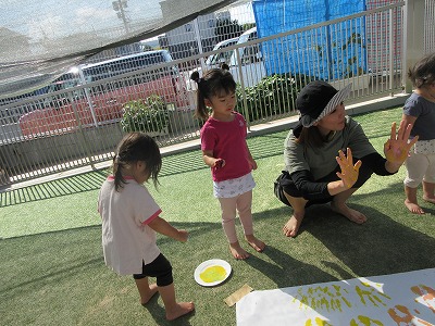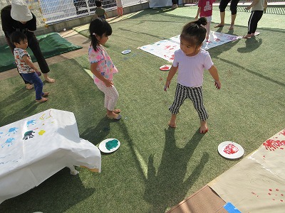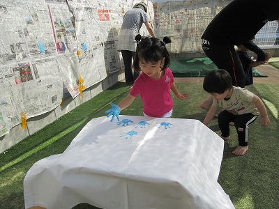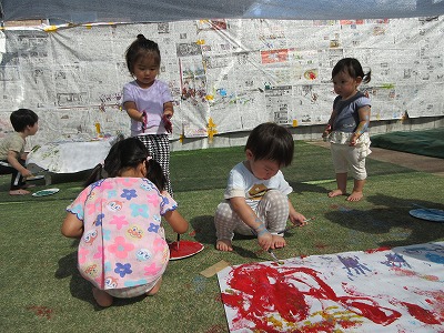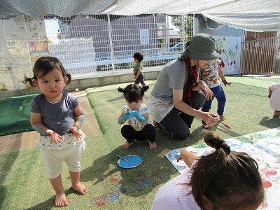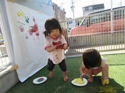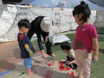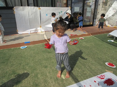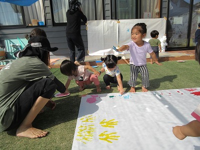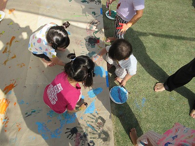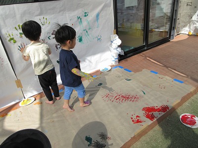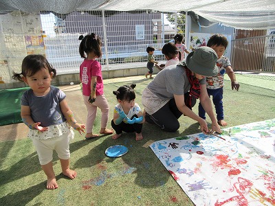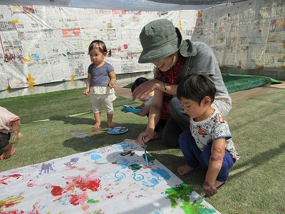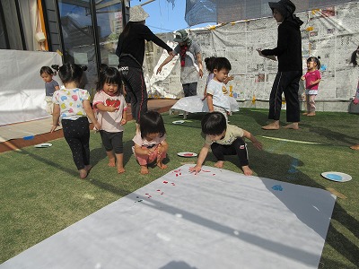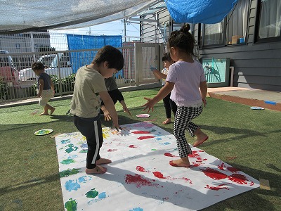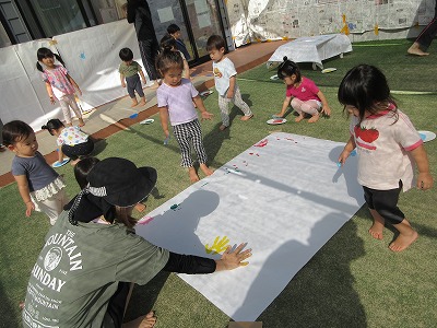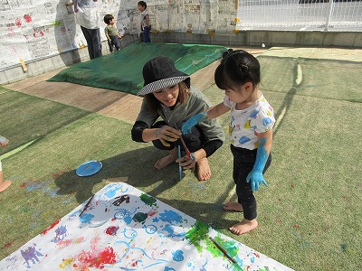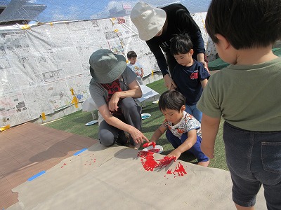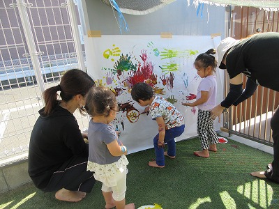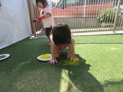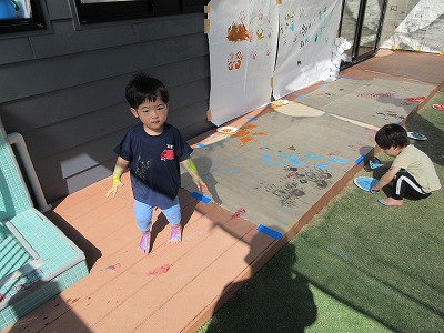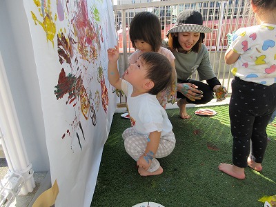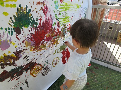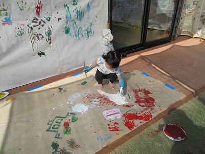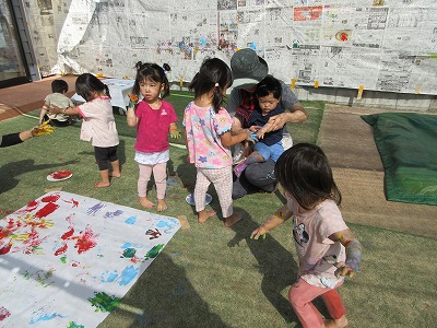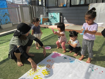 絵の具の感触を楽しんだり、色の混ざり合いで色が変わることを発見したりしていましたよ。絵の具が手につくことに抵抗感がある子もいたので、筆を用意すると、筆で大きな紙に描くことを楽しむ姿が見られました。一人一人のペースで、自分なりに楽しむことができたのでよかったです。
